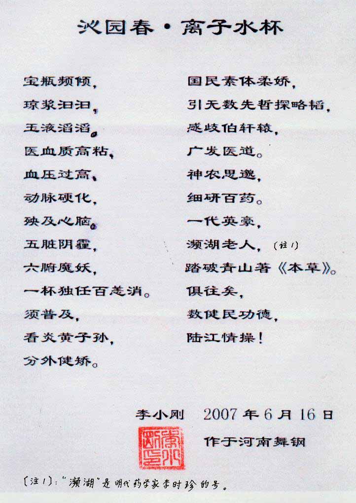-----我是從事建筑的高工,本來沒有資格去攻克醫(yī)學(xué)難題,卻為了自身健康才扣響醫(yī)學(xué)的大門。由于我1990年患高血壓,因怕中風(fēng)才研究發(fā)明了離子水瓶,我把水處理成微小分子團(tuán)水,飲用后治愈了高血壓。便于1993年底送到三家省級醫(yī)院做臨床試用4個月。經(jīng)北京和廣西醫(yī)學(xué)專家鑒定:"降脂降壓效果好"," 能擴(kuò)大心腦動脈流量,改善心腦電圖以及微循環(huán)","對治療心腦動脈粥樣硬化、高血壓、高血脂有良好的醫(yī)療保健作用。""產(chǎn)品的技術(shù)性能和療效達(dá)到了同類產(chǎn)品的國內(nèi)領(lǐng)先水平,經(jīng)廣西醫(yī)學(xué)科學(xué)情報研究所檢索,未見國外有類似報道。"中國醫(yī)學(xué)科學(xué)院張正國教授從美國國立醫(yī)學(xué)圖書館數(shù)據(jù)庫存Medline檢索英俄文資料,均未見類似報告。2000年上市后,我為了對消費者負(fù)責(zé)而繼續(xù)觀察研究,一直通過《信譽卡》和《質(zhì)量跟蹤調(diào)查書》向患者承諾療效,請用戶使用6個月后反饋效果。和脂壓患者飲用2至5個月內(nèi),消除癥狀,停服藥物,血壓正常;冠心病患者飲用3~5個月逐漸減輕至消除心絞痛、房顫等癥狀,不再服藥,飲用1年左右心電圖正常,經(jīng)冠脈造影掃描無明顯狹窄,表明冠心病痊愈。大量患者還反映許多衰弱器官被修復(fù),讓前列腺增生、慢性咽喉炎、慢性氣管炎、支氣管炎、慢性胃炎、腸炎和膽囊炎等不藥而愈;2型糖尿病患者是因為胰島衰弱致病,飲用該水半年至一年,逐漸減藥至停藥,血糖尿糖正常,真正治愈2型糖尿病。中風(fēng)后遺癥患者飲用六七個月,可逐漸減輕至消除肢體和語言障礙,表明飲用該水能讓壽命很長的神經(jīng)元細(xì)胞逐漸修復(fù),奇跡般地恢復(fù)肢體和語言功能。飲用后還使胸腺和脾臟兩個重要的免疫器官被修復(fù)和增強,產(chǎn)生免疫細(xì)胞多,提高了免疫力,使人不生病或少生病。自此, 飲用微小分子團(tuán)水創(chuàng)造了攻克冠心病、高(低)血壓和糖尿病三大醫(yī)學(xué)難題的奇跡。人們對此感到不可思議,但實踐是檢驗真理的唯一標(biāo)準(zhǔn)。